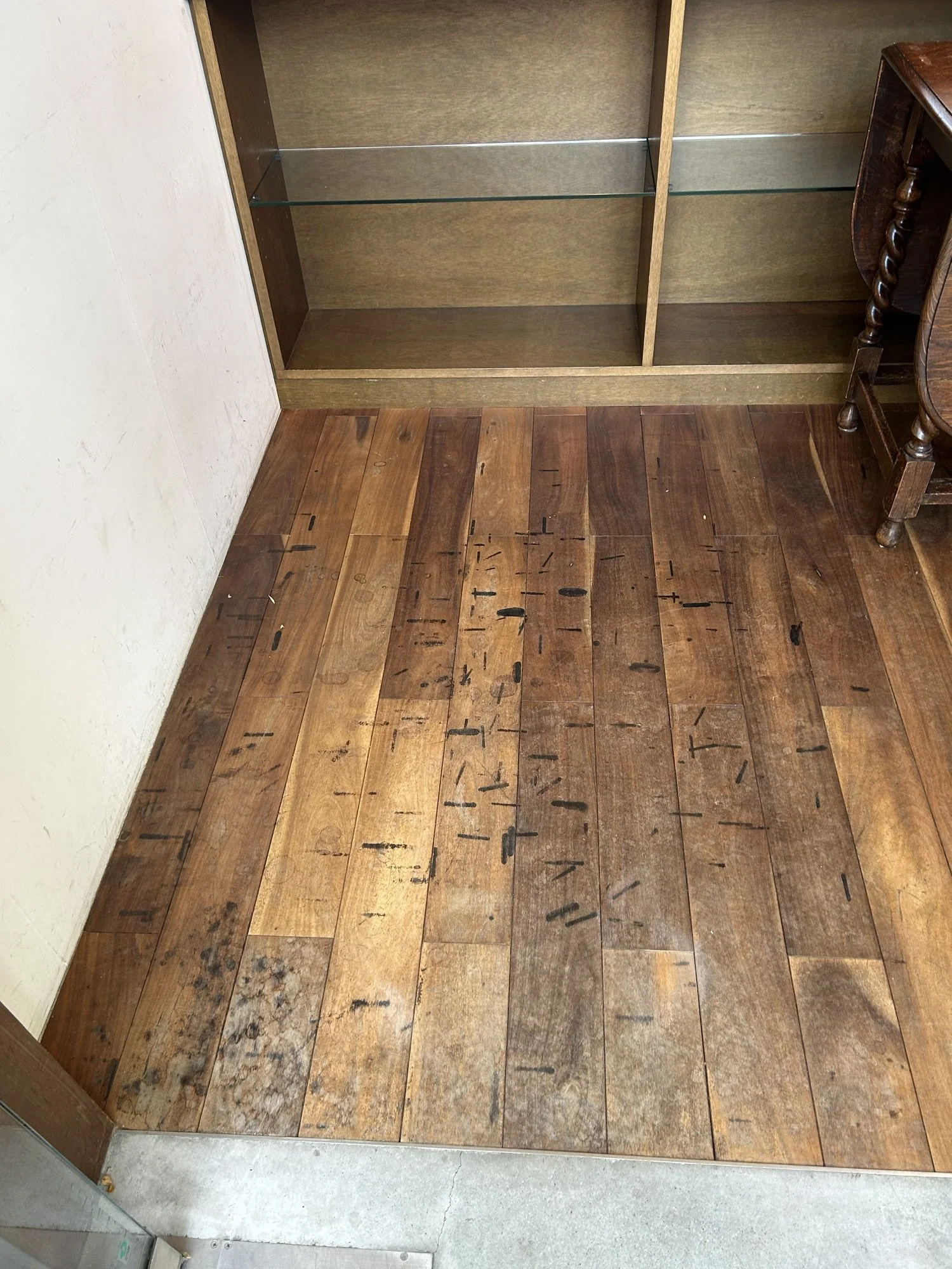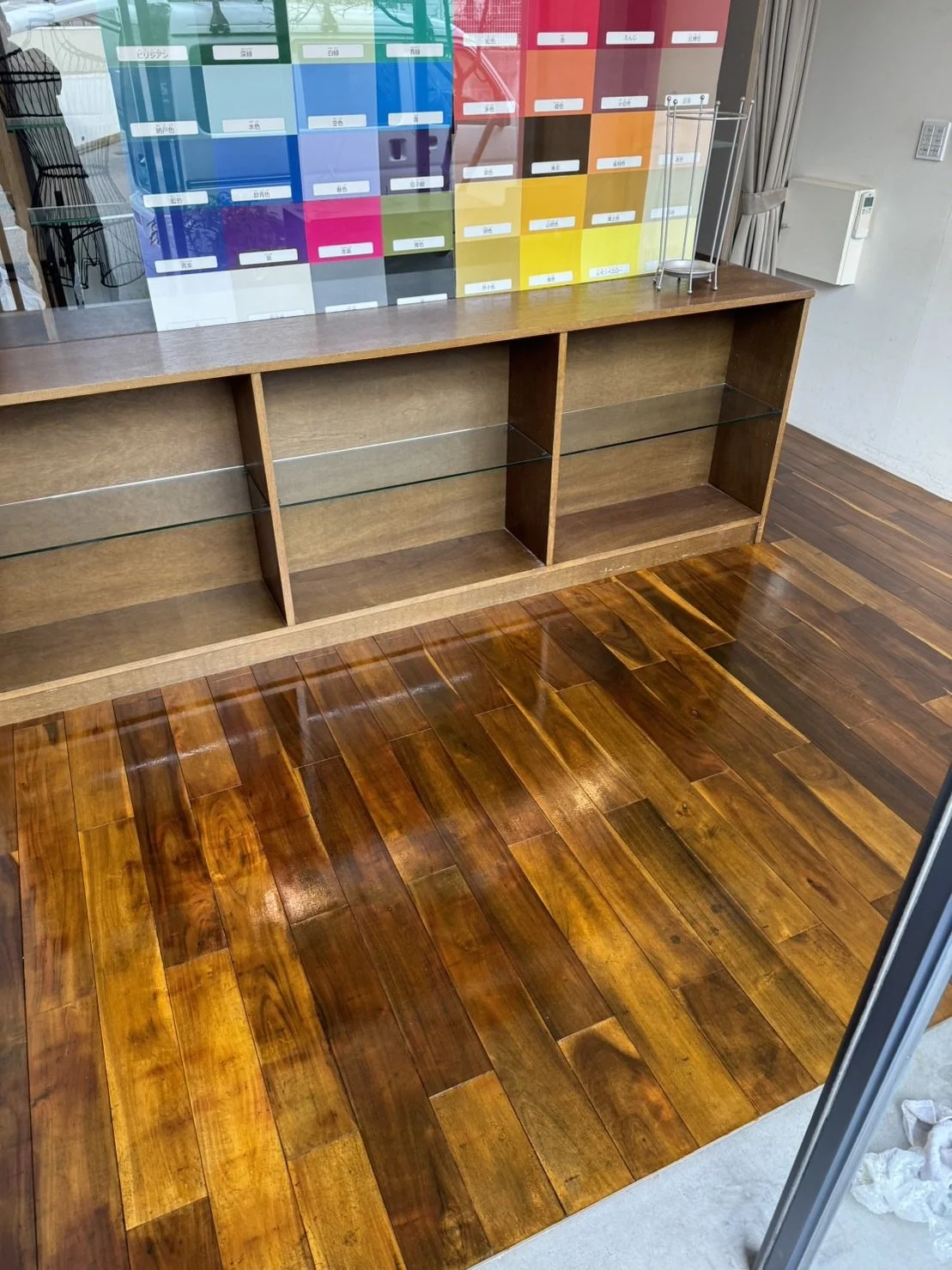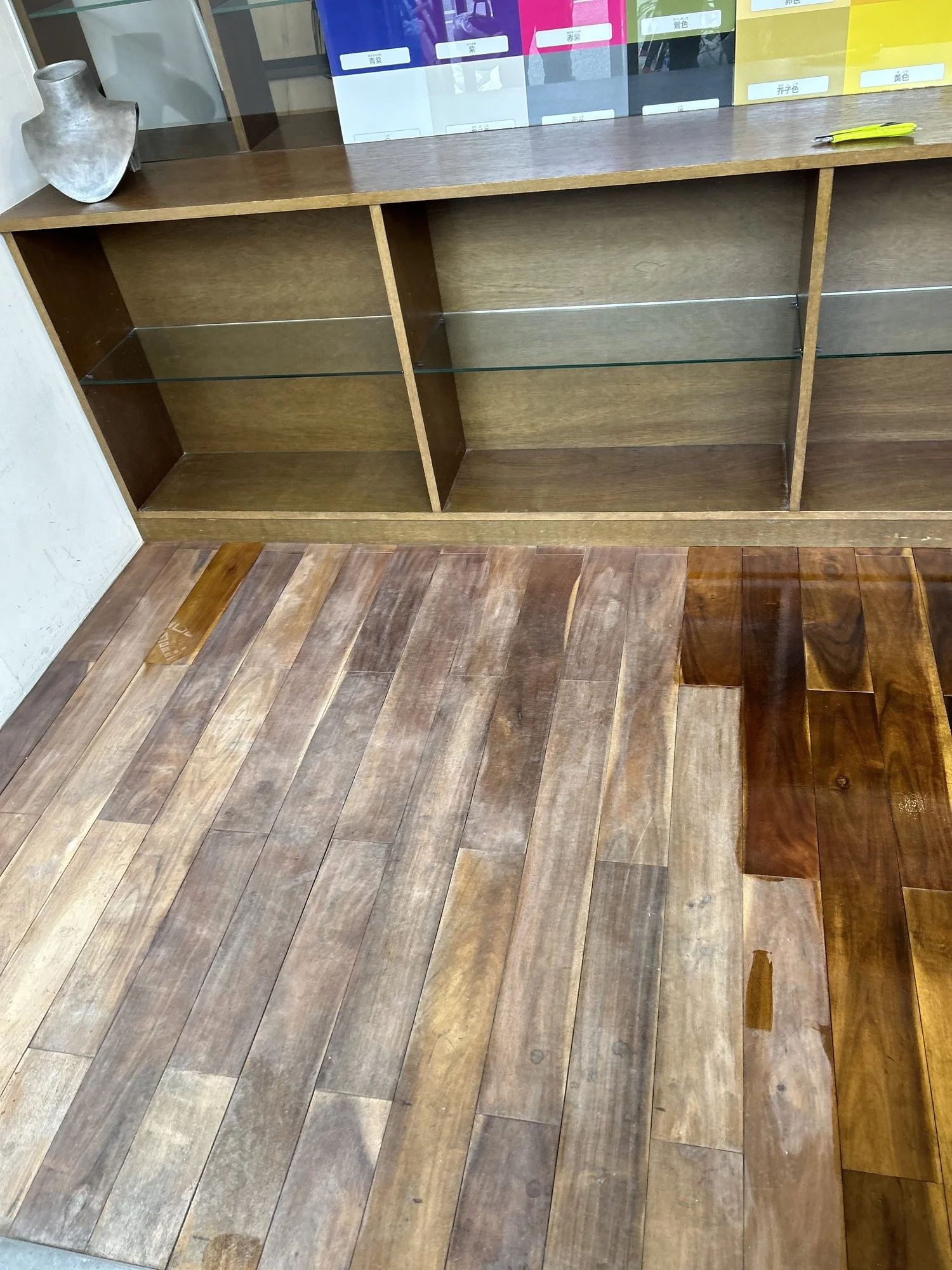 神戸市灘区 無垢フローリング リフレッシュ塗装工事♪ 2月15日 著者 VS DESIGN 劣化して汚れた無垢のフローリング床材を研磨してオイルステンでリフレッシュ塗装♪店舗入り口の鋼製フレームも綺麗になりました^_^ VS DESIGN
