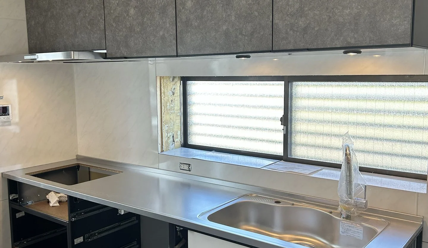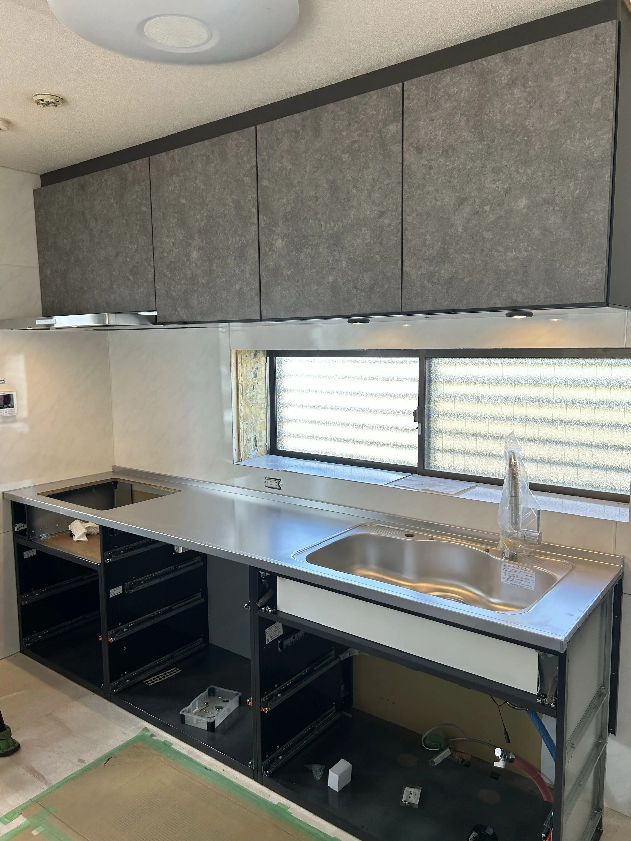 神戸市西区 内装改修工事 10月14日 著者 VS DESIGN 築35年のRC造の戸建住宅のリノベーション工事1階をカフェ店舗 2階を住居スペース低予算でおしゃれな内装に^_^ キッチン入れ替えの下準備😁 キッチン取り付け中^_^ VS DESIGN